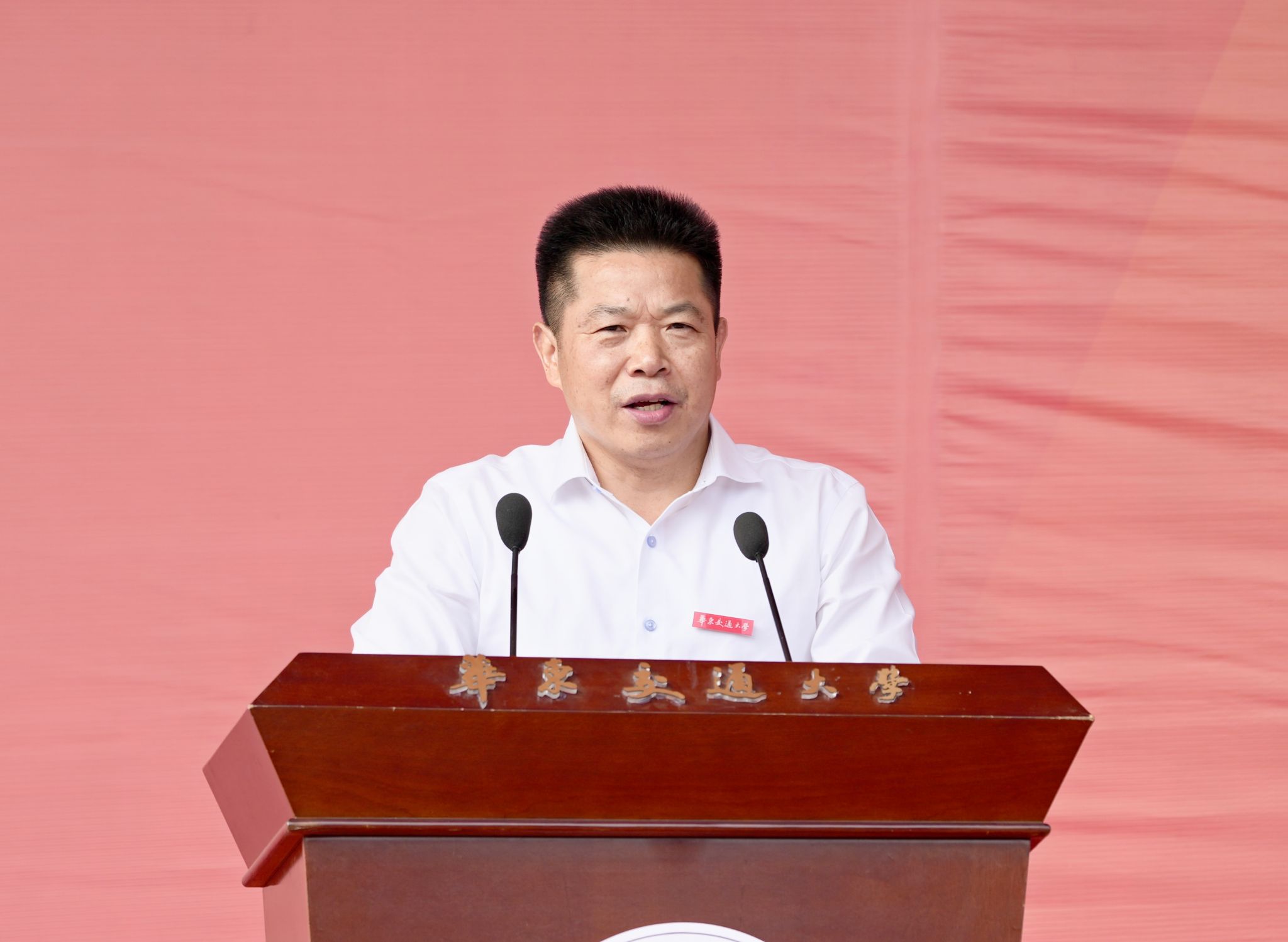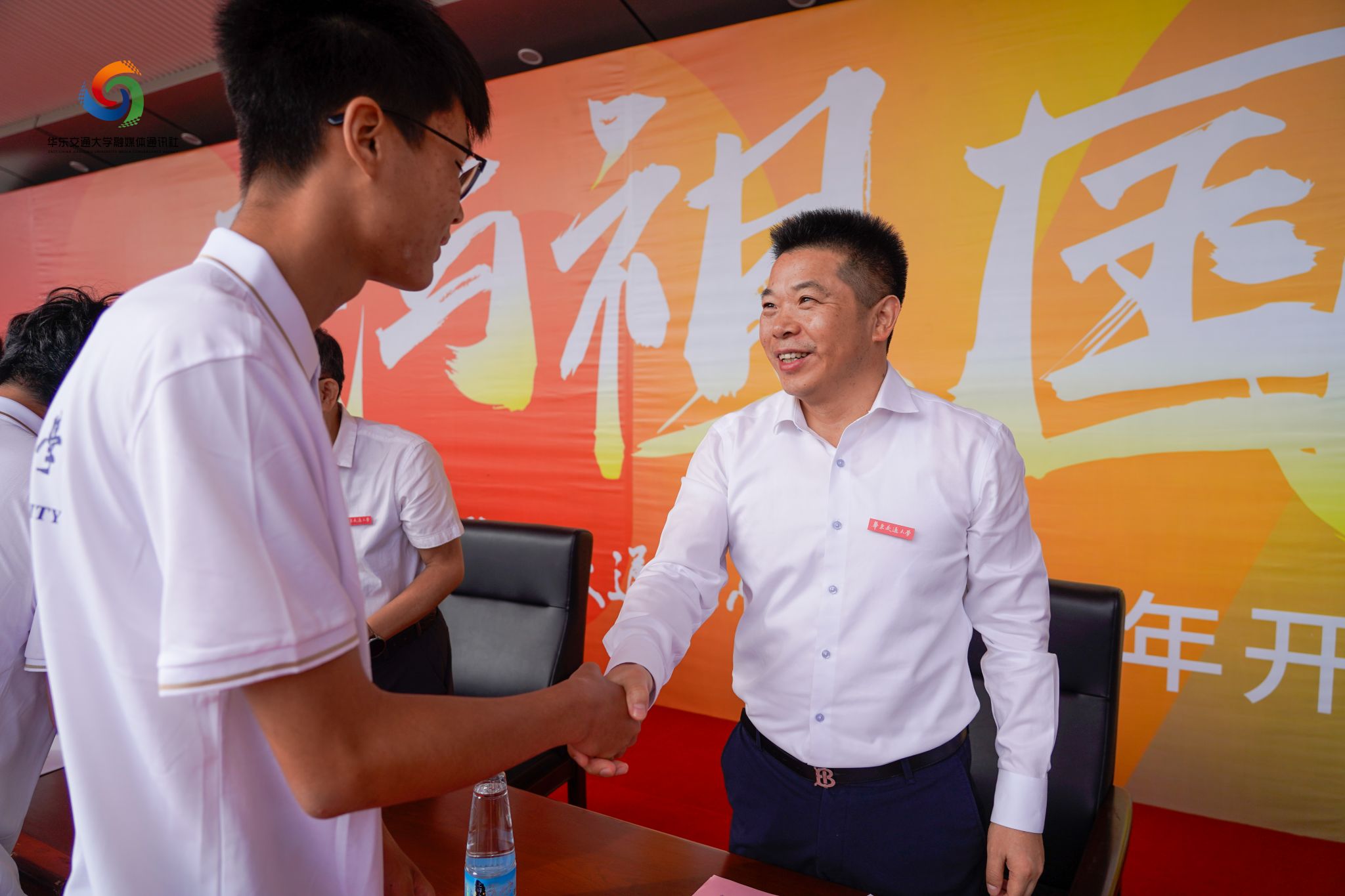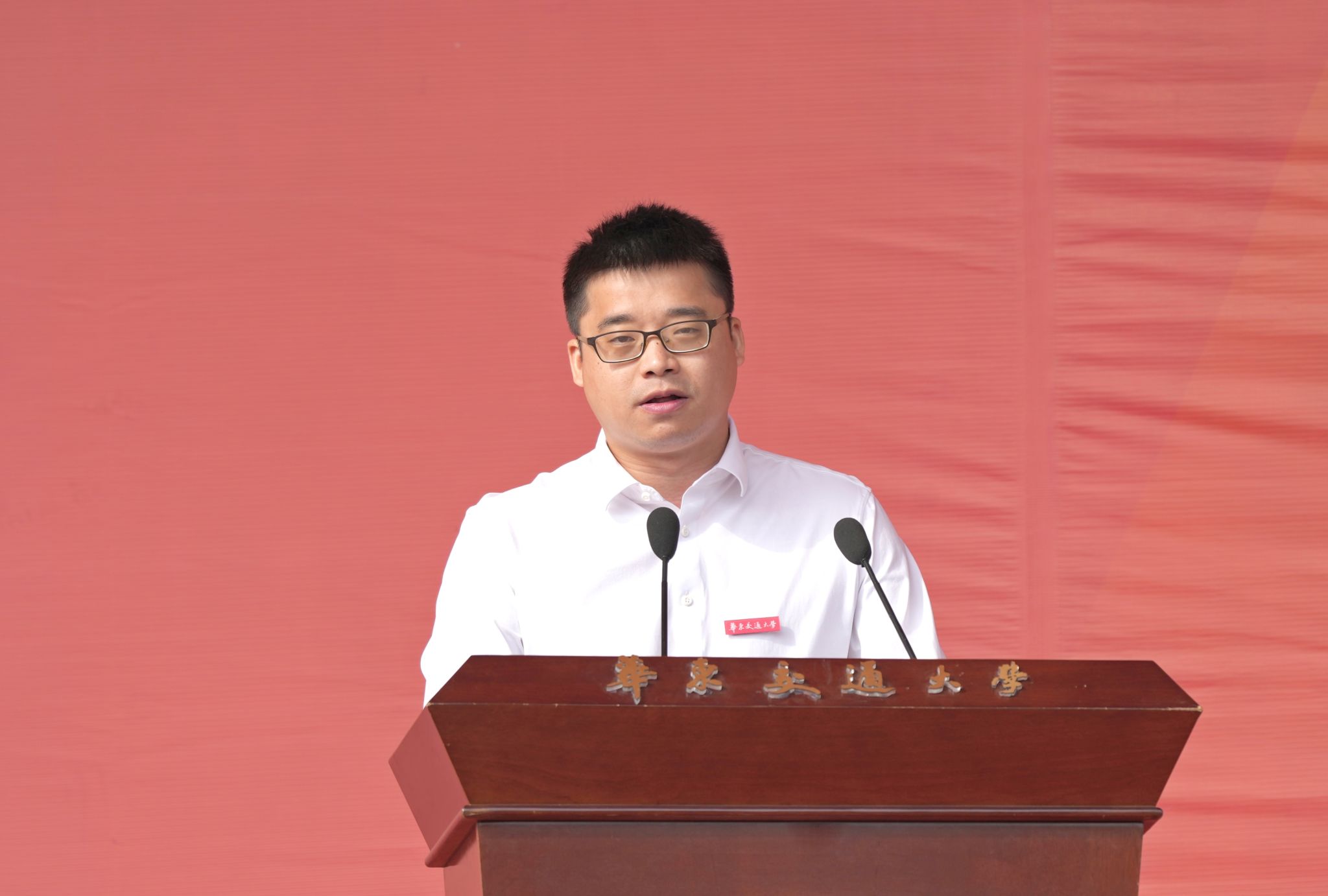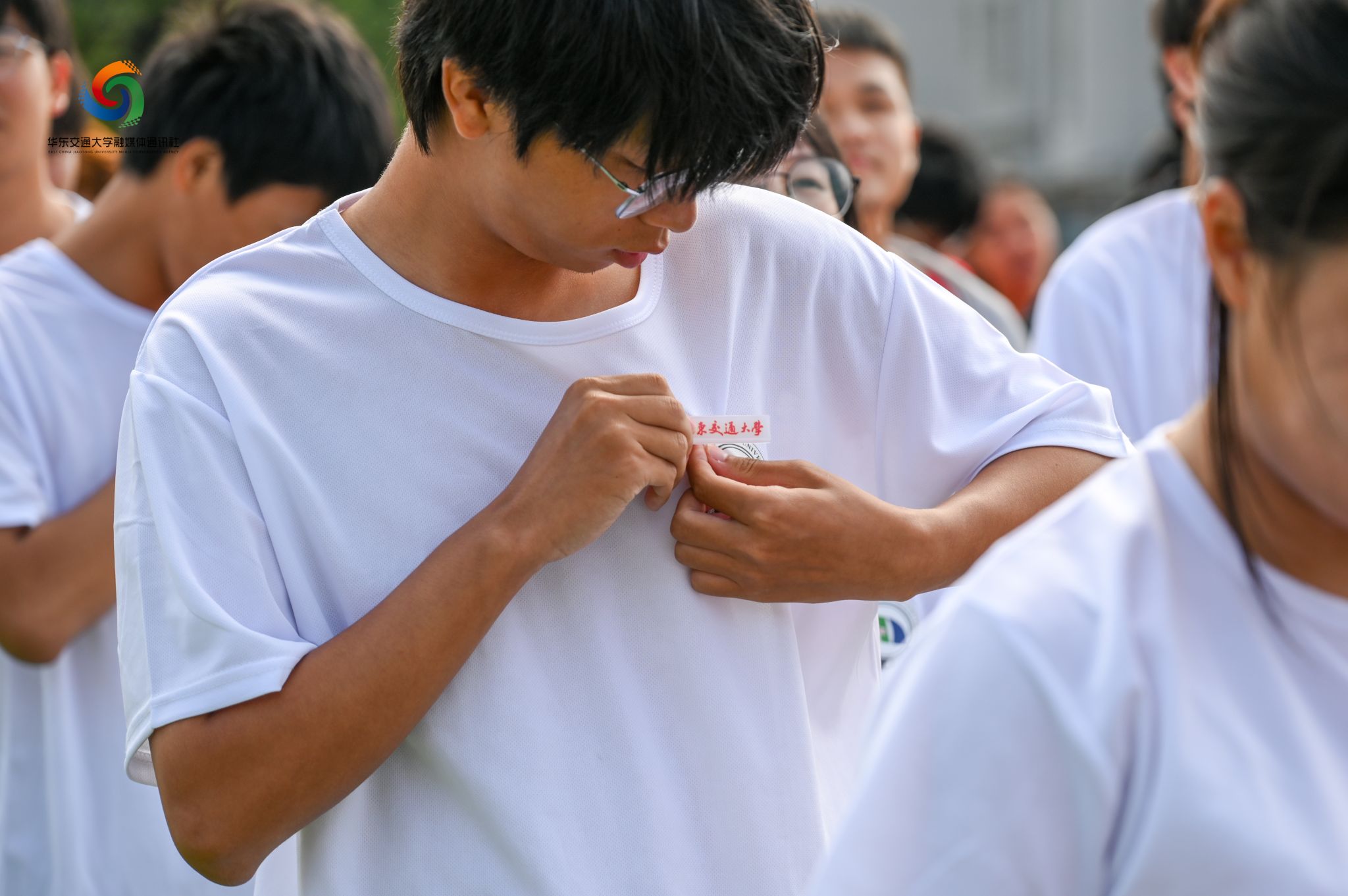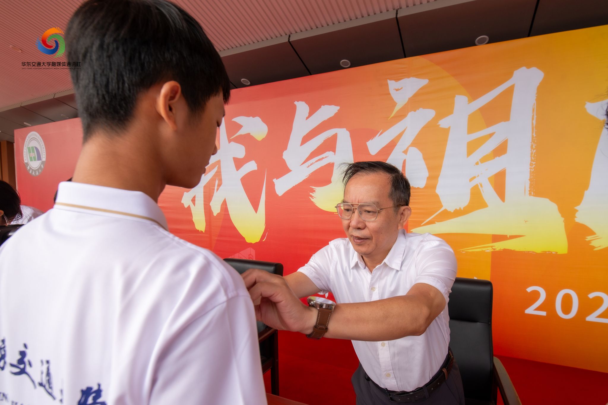 典礼上,校领导特别为当天与学校同庆生日的学生代表佩戴了校徽。随后,全体新生在师长们的见证下,将校徽庄重地佩戴于左胸前,标志着他们正式成为华交大家庭的一员。