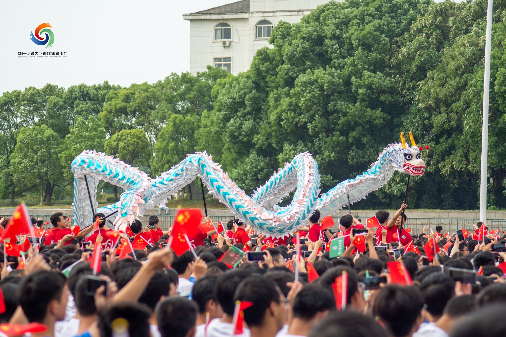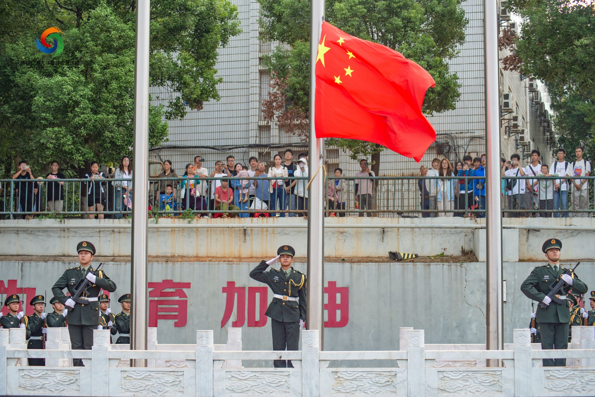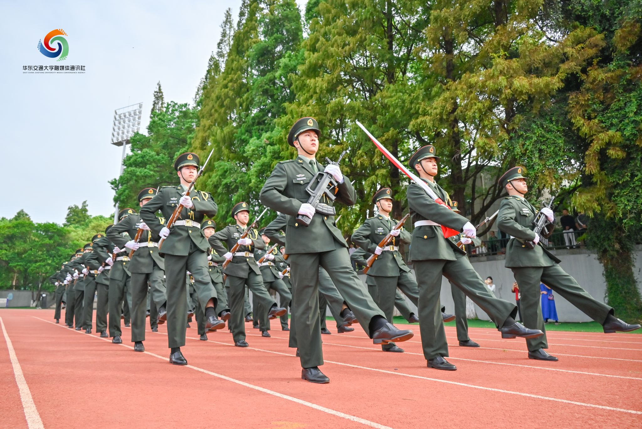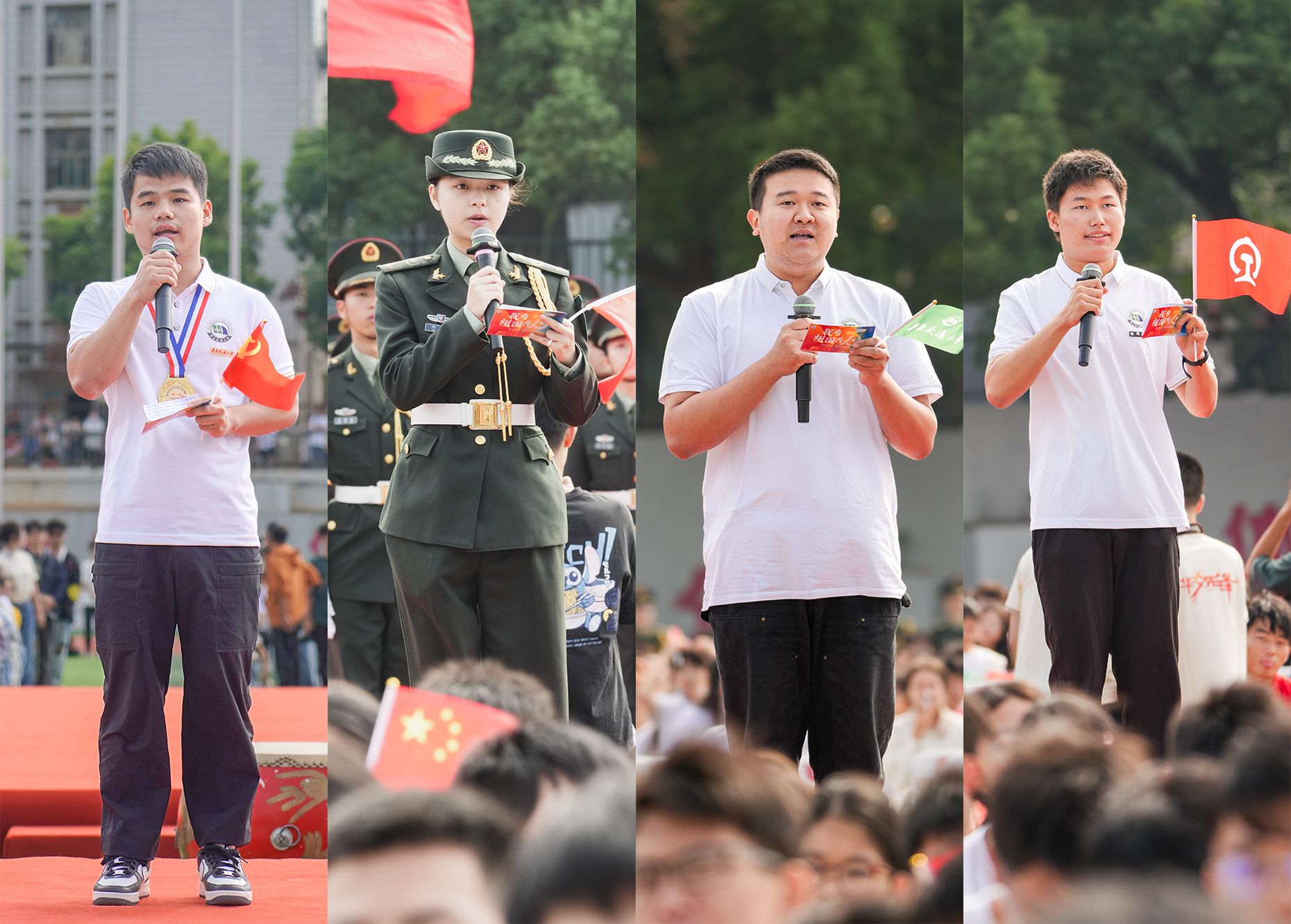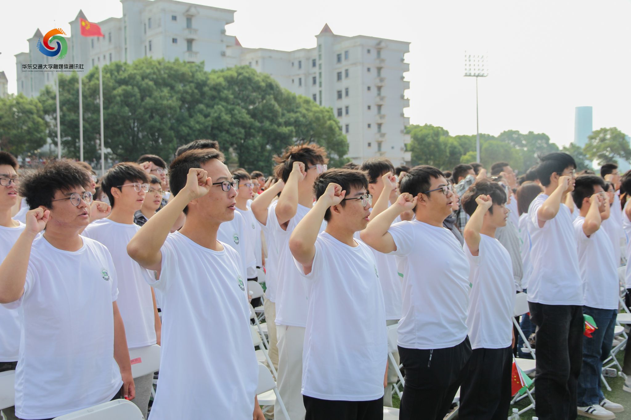 “谨记‘日新其德,止于至善’的校训,秉承‘团结、求实、创新、奋进’校风。争当‘铁心铸忠诚、铁血报家国、铁肩担使命、铁手创大业’的新时代铁人铁军!”——在典礼的高潮部分,全体新生集体宣誓,向祖国致以青春的礼赞,向华交许下青春的誓言。