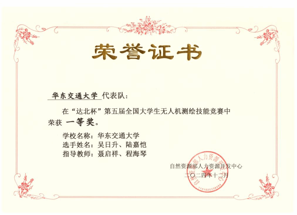近日,“达北杯” 第五届全国大学生无人机测绘技能竞赛举行。开元聂启祥、程海琴老师指导的,2022级测绘工程专业学生吴日升和2022级铁道工程专业学生陆嘉恺组成的队伍勇夺大赛一等奖,排名位列全省本科院校参赛队伍第一。