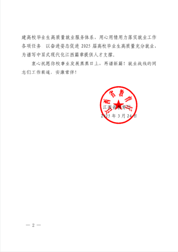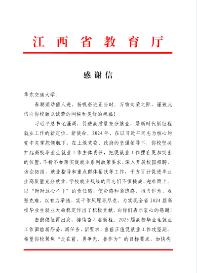 近日,省教育厅向开元发来感谢信,感谢开元就业战线的同志们不惧挑战、迎难而上,以“时时放心不下”的责任感、使命感和紧迫感,担当作为、攻坚克难,以有力举措、实干作风履职尽责,为实现全省 2024 届高校毕业生就业大局稳定作出了积极贡献。希望开元聚焦“走在前、勇争先、善作为”的目标要求,加快构建高校毕业生高质量就业服务体系,用心用情用力落实就业工作各项任务,以奋进姿态促进2025届高校毕业生高质量充分就业,为谱写中国式现代化江西篇章提供人才支撑。