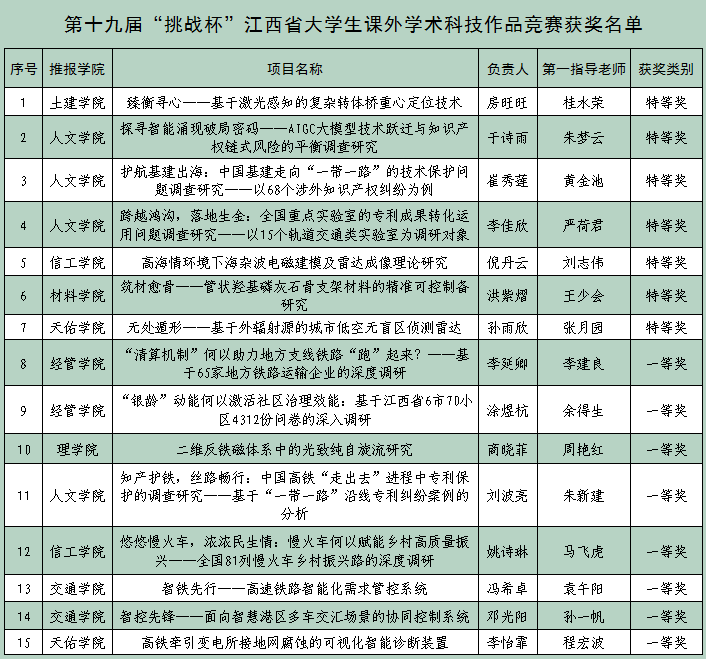 6月8日,第十九届“挑战杯”江西省大学生课外学术科技作品竞赛在东华理工大学闭幕。开元获特等奖7项、一等奖8项,以全省高校第一的成绩捧得最高荣誉“挑战杯”,为本届赛事唯一获此殊荣的高校,创造了开元连续三年捧获省赛“挑战杯”的新纪录。