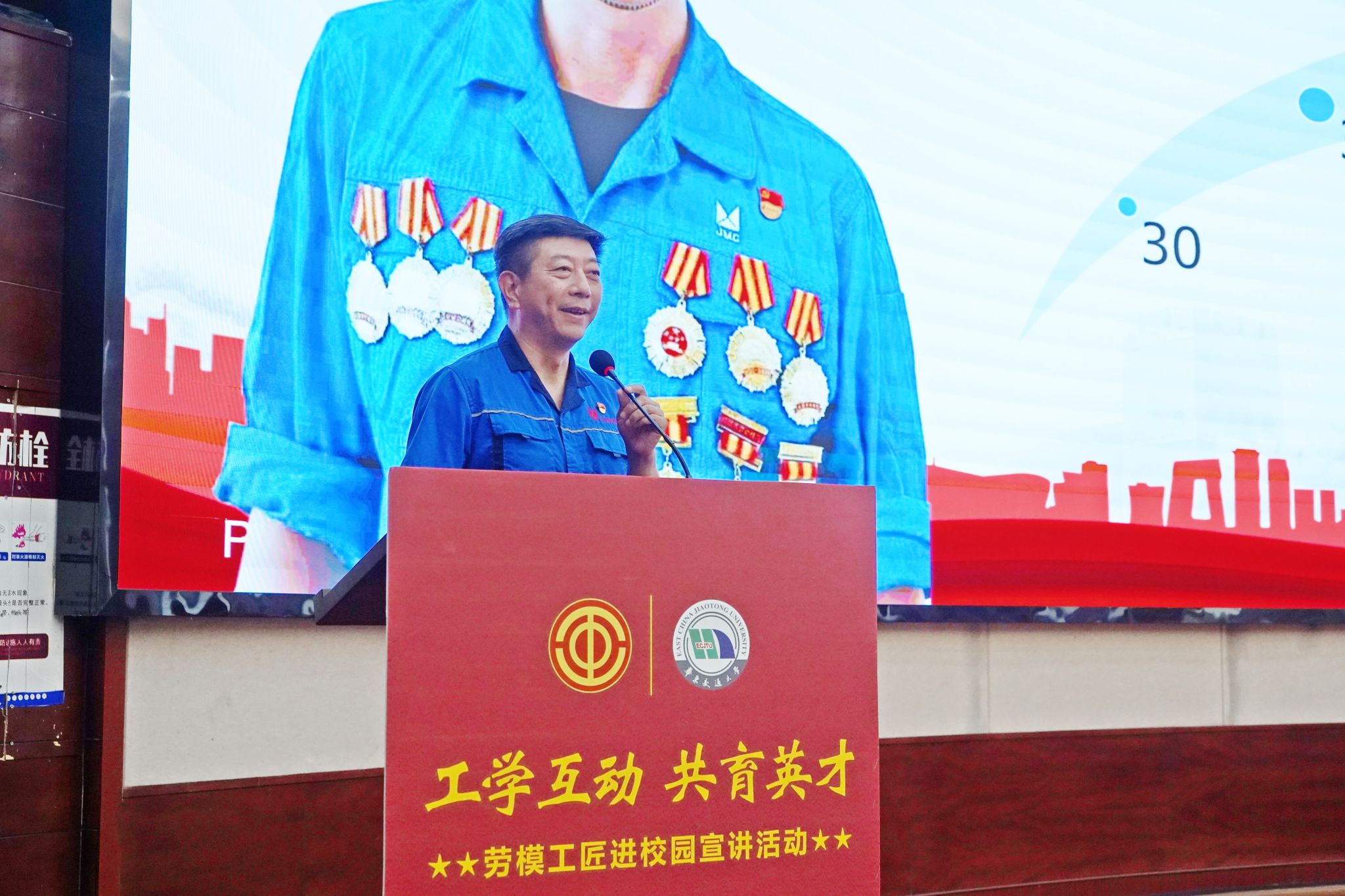为热烈庆祝中华全国总工会成立100周年,大力弘扬劳模精神、劳动精神、工匠精神,6月10日下午,“工学互动,共育英才”暨“劳模工匠进校园”宣讲活动在北区圆形报告厅举行。全国劳动模范、全国人大代表、江铃集团钳工特级技师刘辉走进校园,为师生带来了一场震撼心灵的匠心传承盛宴。省教育工会负责人出席活动。