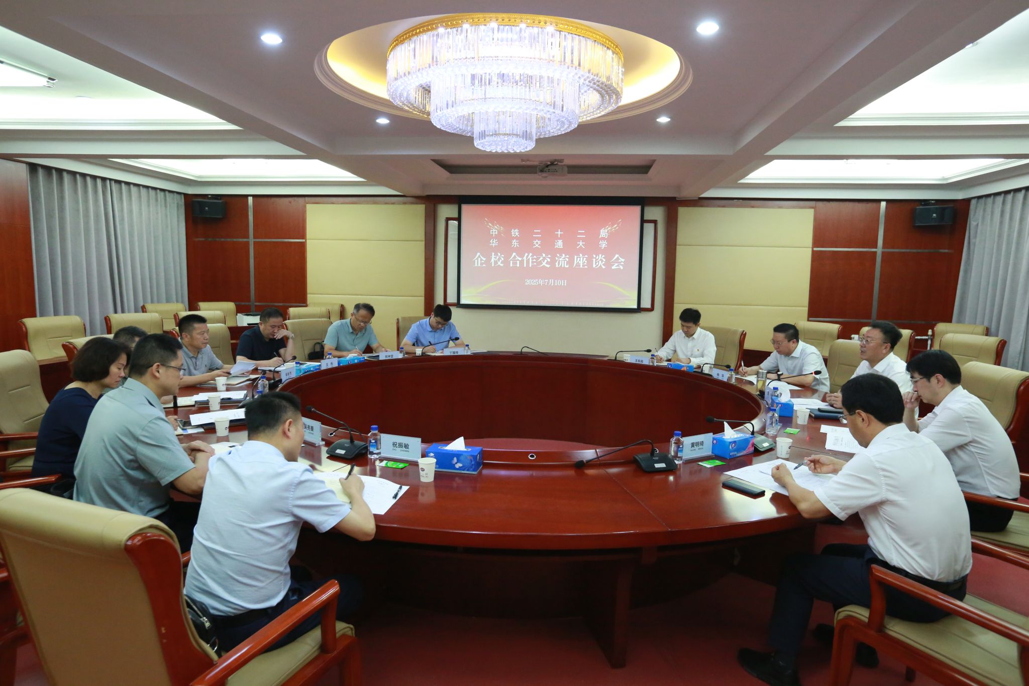 科发院、招就处、外联处、土建学院、电气学院、交通学院、继教学院负责人陪同走访,中铁十六局、中铁六局、中铁二十二局、中铁北京局相关部门负责人参加座谈。