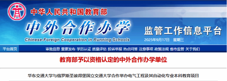 近日,教育部公布了中外合作办学项目最新评审结果,学校与俄罗斯圣彼得堡国立交通大学合作举办的电气工程及其自动化专业本科教育项目正式获批,这是学校获教育部批准的第三个中外合作办学项目,对进一步加强学校学科建设,构建具备国际视野的专业人才培养体系,提升学校国际化办学水平具有重要意义。