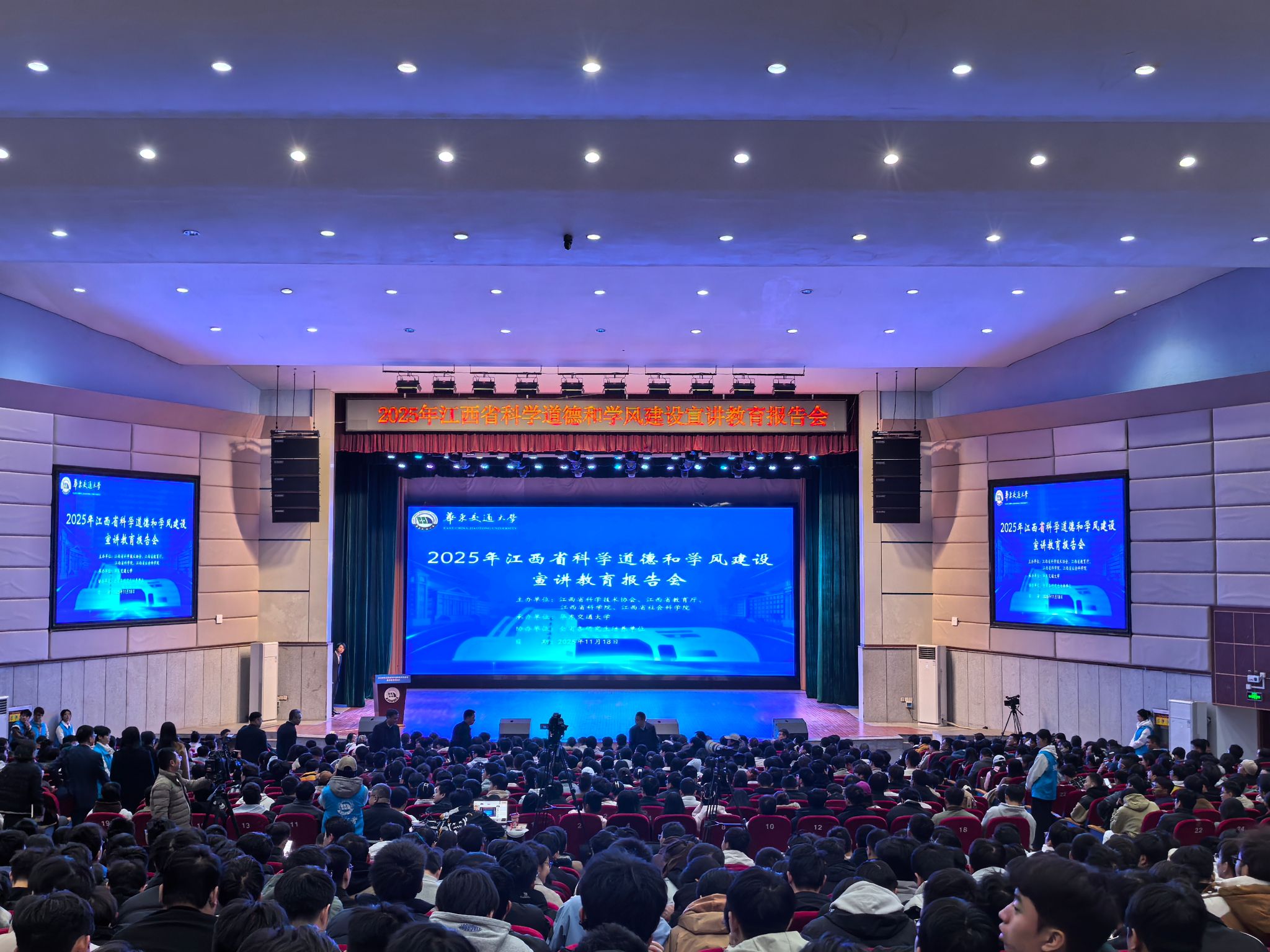 11月18日,2025年江西省科学道德和学风建设宣讲教育报告会在开元南区礼堂举行。省科协党组成员、副主席章新建,开元党委委员、副校长肖乾出席并致辞。江西省教育厅二级巡视员雷杰华,江西省科学院党组成员、副院长范敏出席报告会。