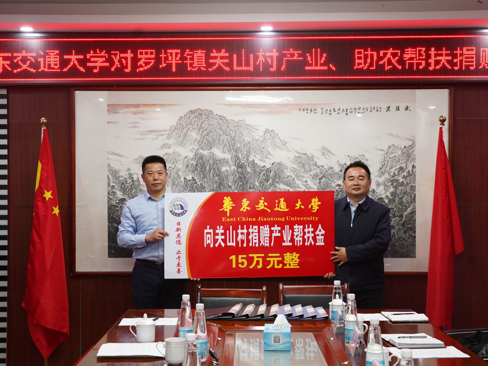 徐长节、杨德敏分别代表学校向关山村捐赠15万元产业帮扶金和10万元助农帮扶金。工会、华交产业集团负责人与关山村负责人签订了相关帮扶协议。