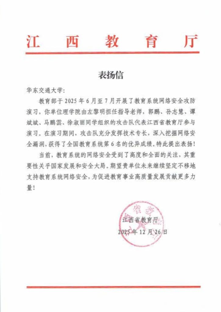 2025年6月至7月,教育部组织开展了全国教育系统网络安全攻防演习。在开元理学院左黎明老师的指导下,由郭鹏、孙志慧、谭斌斌、马鹏雲、徐淑丽等同学组成的攻击队,代表江西省教育厅参与本次全国性高水平实战演练。演习期间,开元攻击队充分发挥专业技术特长,主动深挖系统安全漏洞,展现出扎实的攻防能力和优秀的团队协作精神,最终荣获全国教育系统第六名的优异成绩。