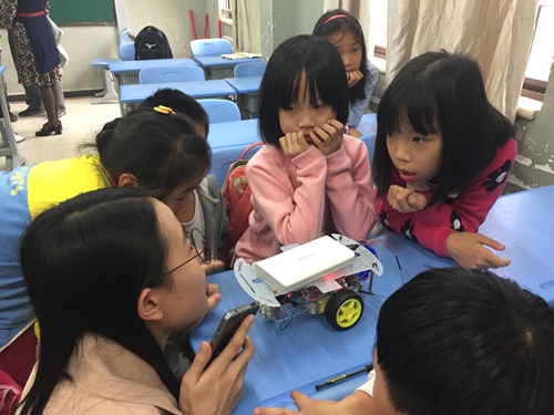 “为什么它有四个风扇叶?”“为什么这个存钱罐上面有定时炸弹上的那种数字屏幕,会爆炸吗?”当小学生看到眼前走过的哥哥姐姐手中抱着的“科技作品”时,眼中透露出好奇的目光。四旋翼无人机、基于图像识别的避障智能小车、太阳能供给角度自适应智能车、智能电子称、炫彩光立方、智能存钱罐……各式各样的科技作品在小学生眼中变成了新奇玩具,各种千奇百怪的问题层出不穷,信息学院学生卓越党支部的学生耐心地为小学生一一做出讲解。