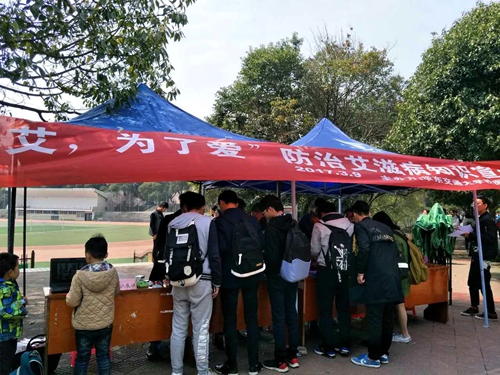 在艾滋病知识普及部分,志愿者们向路过的学生发放预防艾滋病的宣传资料,同时播放艾滋病宣传视频,向大家介绍防控艾滋病的重要性,希望引起每一位同学对艾滋病危害的重视。同时现场示范学习正确使用佩戴安全套,了解避孕套在艾滋病预防中的重要作用。医护人员开展艾滋病相关知识现场咨询,并发放“青年学生艾滋病知识知晓率调查问卷”表。