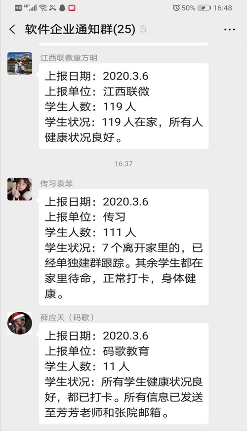 自疫情发生以来,学院第一时间联系6家合作企业,并与449名企业班学生及家长一一沟通,明确要求在学校正式开学前,学生不得提前参加实习,已在外实习学生必须按照属地管理原则,服从当地政府统一管理。同时,每天在网上进行打卡,由企业老师登记、汇总,及时反馈给学院分管领导和学生辅导员。