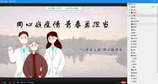 17级通信卓越1班班长刘文杰通过视频短片,引领大家共同回顾了在过去一个多月中,全国上下一心共抗疫情的感人场景,视频中的“中国力量”“中国速度”“中国担当”给同学们留下了深刻的印象。