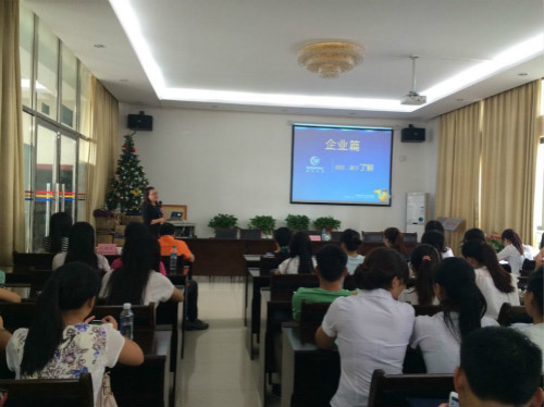 随后校友吴琦华讲话并希望通过招聘会能为学弟学妹更多就业机会。接着行政人力资源部经理王艳凤进行企业宣讲,主要从企业的核心竞争力、企业文化、产品系列及薪资福利等为同学们进行了详细介绍,并与大家分享自身经历。此外,王艳凤还就同学提出的问题做了详尽的回答,与外国语学院毕业生进行了亲切的交流互动。宣讲会后,外国语学院2015届毕业生积极投简历。