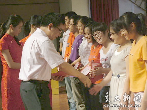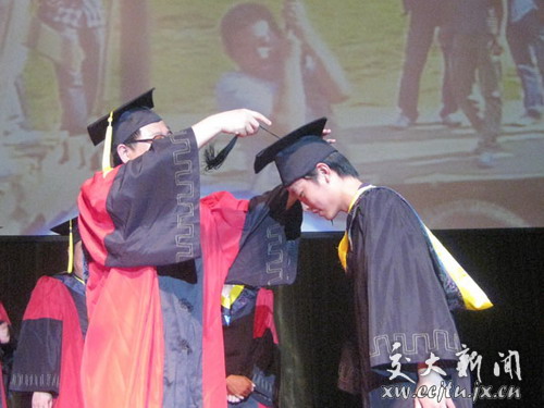 “各自务功业,当须激深衷。别后能相思,何嗟山水重。”6月25日下午,电气学院2010届毕业生毕业典礼在南区礼堂举行。电气学院院长宋平岗、党委书记王银乐、副书记张晓明,刘百芬、林知明、刘子英教授等出席了典礼。与会领导、老师为2010届544名毕业生扶正流苏,并为“优秀毕业生”、全国电子设计大赛二等奖及全省电子竞赛一等奖、省“三好学生”及省“优秀学生干部”等奖项获得者颁发了证书。