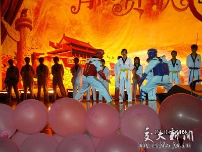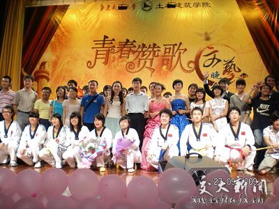 “深情款款的情歌对唱,技惊全场的跆拳道表演,神秘莫测的读心术,余音绕梁的《爱我中华》......金秋交大吹来一丝喜迎祖国60岁生日、欢迎09级新生的暖风”,9月27日晚7:00,土建学院庆祝祖国60华诞暨“青春赞歌”大型迎新晚会在南区礼堂隆重开幕。