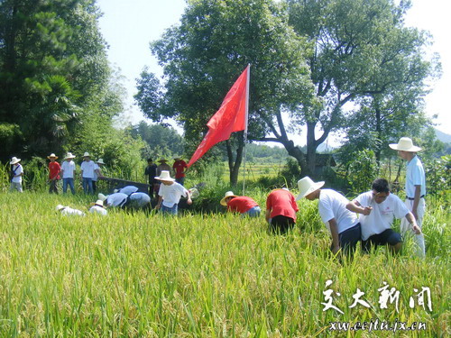 到达目的地不久,学员们便在当地老农的带领下,扛起打谷机,拿起镰刀奔赴稻田。他们纷纷卷起裤腿,下到田间地头帮助村民割稻、打稻,对于很少拿起镰刀的大学生们虽然是第一次割稻,动作有点生疏,但他们学得认真,干得起劲。队员们还有说有笑,这边割稻割得欢畅,那边打谷也打得像模像样。一位村民见了,直夸“这些大学生书读得好,农活也干得利索,真了不得!”