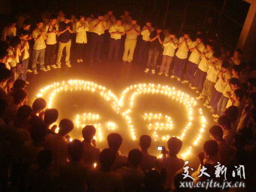 入团仪式结束后,学生用红烛在地面上摆出巨大的“心”形和“5•12”字样,所有在场学生和老师围站在“心”的一周,所有人默默闭上眼睛,双手合十,为所有在地震中遇难同胞默哀三分钟,为地震中逝去的生命祈福,希望烛光能照亮通往天堂的路,为他们送去最美好的祝福。