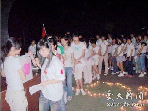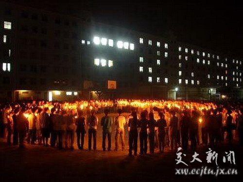 当晚,同学们聚集在篮球场上,百余名同学共同点燃排成心型和“5.12”字样的蜡烛,跳动的“心”光刹那间照亮了整个校园的上空。大家手持烛火,虔诚站立,表达对死难者的深切悲悼和对受困同胞的衷心祈愿。 并共同为这次地震中丧生的同胞默哀三分钟,默默的祈福,祝愿灾区的人民早日渡过难关!大家高喊着:“中国加油,四川加油,汶川加油!”,同时深信,爱心的火焰和人性的光辉,一定会驱走灾难带来的黑暗,给灾区同胞以温暖的勇气和力量,让他们从废墟中坚强地站立起来!