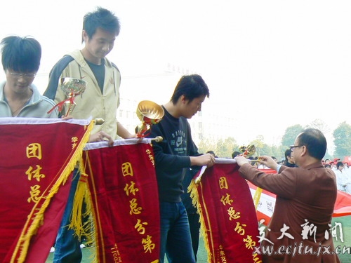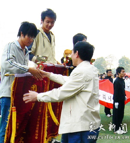 熊国良院长为荣获团体总分第一名的经管分院颁发奖杯和锦旗。