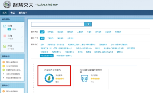 1.企业(团队)负责人通过智慧交大中的服务大厅进入“科技园入驻预报名”,填写企业(团队)基本信息。具体路径:智慧交大→服务大厅→科技园管理办公室→科技园入驻预报名,如下图: