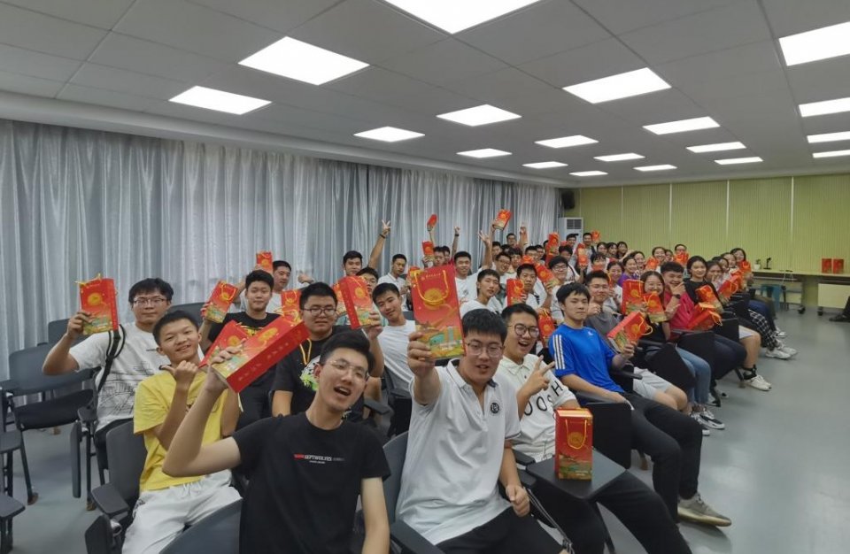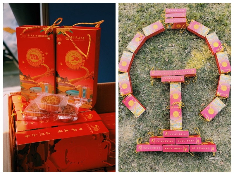 今年,每位学生可拿到两块不同口味的月饼,分别印有校徽和50周年校庆LOGO,礼盒外包装寓意校友从祖国各地乘高铁回家为母校庆生。