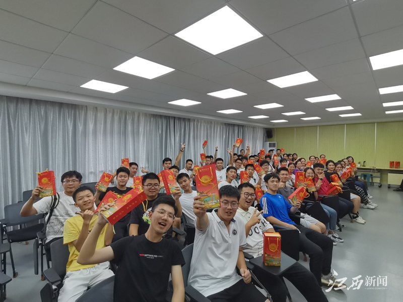 今年,每位学生可拿到两块不同口味的月饼,分别印有校徽和50周年校庆LOGO,礼盒外包装寓意校友从祖国各地乘高铁回家为母校庆生。