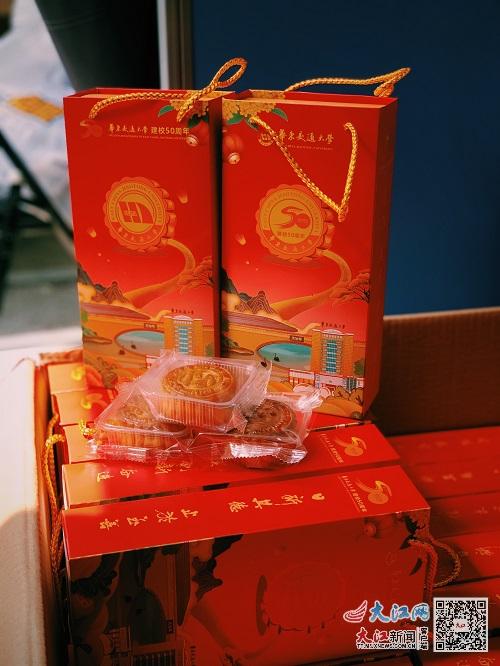 今年,每位学生可拿到两块不同口味的月饼,分别印有校徽和50周年校庆LOGO,礼盒外包装寓意校友从祖国各地乘高铁回家为母校庆生。