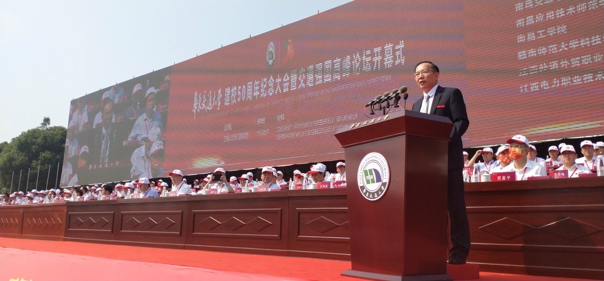 柳和生在主持时指出,华东交大原隶属铁道部,现为江西省人民政府与中国国家铁路集团有限公司和国家铁路局“双共建”高校。姓“铁”是学校的出身,兴“铁”是学校的使命。“铁”是学校先天醒目的胎记和后天夺目的标记。50年来,学校始终不忘初心、砥砺前行,铁血报家国、铁肩担使命、铁手创大业,培养造就了一批批铁人、一支支铁军,铁心对标国家重大战略、贴心服务江西发展需求,为国家和江西经济社会发展作出了积极贡献;50年来,学校始终坚持“交通特色、轨道核心”的办学定位,努力做有特色的异军,谋求异军突起并大放异彩。举行建校50周年纪念大会暨“交通强国”高峰论坛,这既是对办学历史的真情追忆,也是对伟大时代的深情礼赞;既是回顾峥嵘岁月稠的成就展,也是吹响奋进新征程的冲锋号。