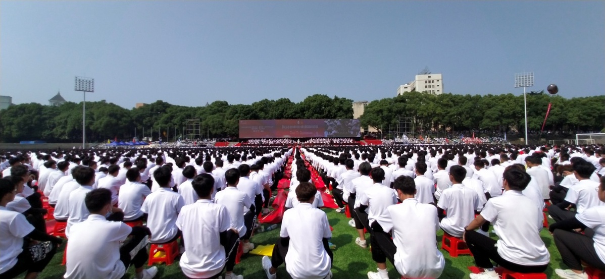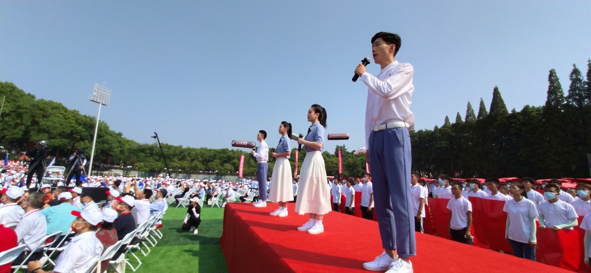 《星辰大海》《二十年后来相会》《赞赞新时代》《青春畅想》……大会开始前,4000名2021级大一新生组成4个巨型方阵,共同唱响昂扬奋进的青春旋律。在万众欢呼中,“贵赣情·校友行”千里接力“风火轮”跑团,与各地校友代表和师生代表,豪迈地迈进大会现场。伴随着热情铿锵的青年学生献词,巨型方阵变换成中国共产党成立100周年庆祝活动标识、中国地图、中国铁路路徽等图案或字样,彰显了全体华交人铁心跟党走、铁肩担使命的赤诚与担当。