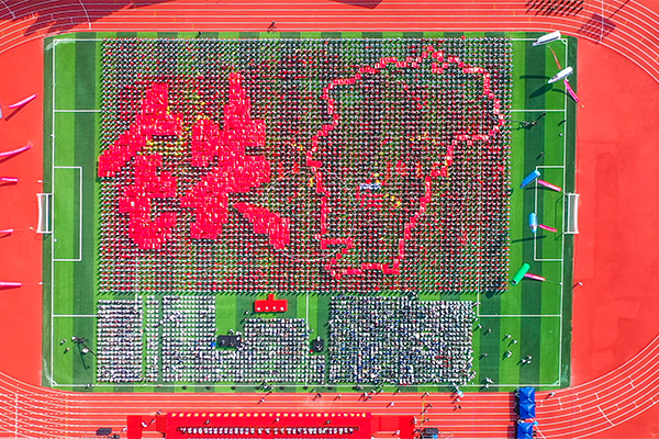 《星辰大海》《二十年后来相会》《赞赞新时代》《青春畅想》……大会开始前,4000名2021级大一新生组成4个巨型方阵,共同唱响昂扬奋进的青春旋律。在万众欢呼中,“贵赣情·校友行”千里接力“风火轮”跑团,与各地校友代表和师生代表,豪迈地迈进大会现场。伴随着热情铿锵的青年学生献词,巨型方阵变换成中国共产党成立100周年庆祝活动标识、中国地图、中国铁路路徽等图案或字样,彰显了全体华交人铁心跟党走、铁肩担使命的赤诚与担当。