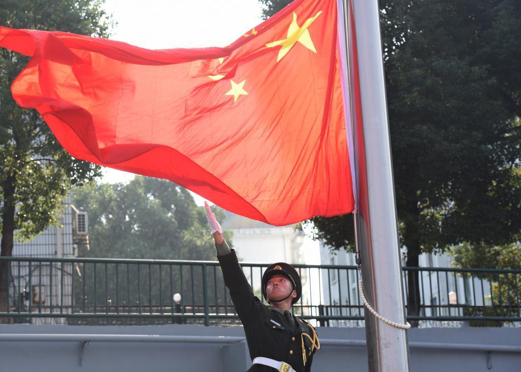 上午10时,国旗护卫队迈着矫健的步伐,护送五星红旗,走向升旗台。全场齐声高唱国歌,鲜艳的五星红旗迎风飘扬,冉冉升起。