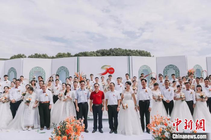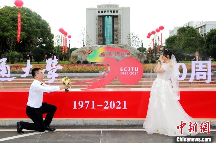 9月20日,在KY开元集团官网入口50周年纪念活动期间,来自全国各地的50对校友伉俪重返校园,举行集体婚礼。 华东交大供图