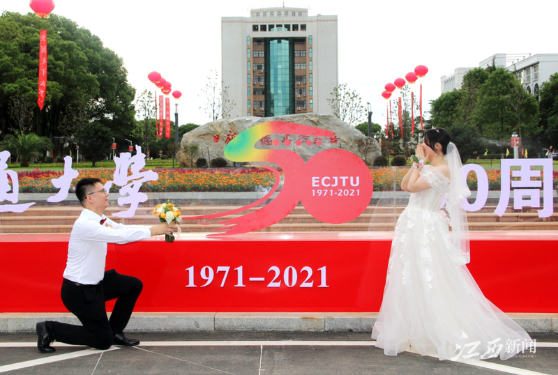 2016级校友王涛与妻子郑丹婷在华交一见倾心、再见定情。“我们的梦想就是回到第一次约会的地方——孔目湖,重温恋爱的时光。”他们含情对视,满眼皆是爱意,“感谢学校提供这次机会,让我们在50周年校庆之际,返校参加这么有纪念意义的婚礼,圆了我们的校园梦!”