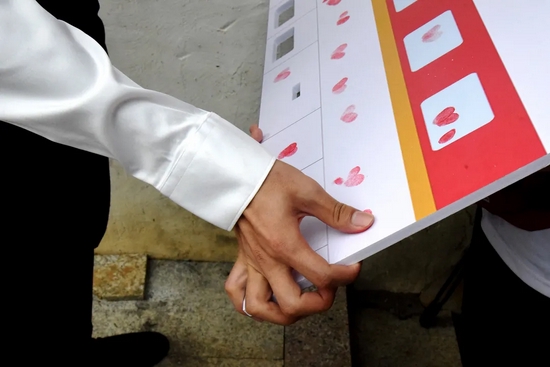 “感谢相遇,牵起你的手,风雨同舟,祸福同渡……”50对伉俪在母校的见证下宣读爱的誓言,交换校庆定制版对戒并拥吻。在用爱心打造的“华交幸福号”列车上,他们留下爱的手印。在观众的欢呼声中,抛出爱的纸飞机、手捧花,将现场气氛推向高潮。