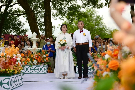 随后,50对伉俪乘坐花车一览校园风光,观看快闪,打卡留影,将笑容和身影定格在这一刻。