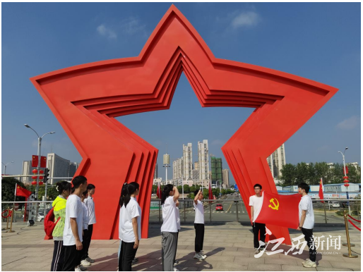 旭日初升,同学们呈“72”字样列坐在“军旗升起”主雕阶梯上,挥动小红旗,唱响《我和我的祖国》,把最真挚的爱和祝福献给祖国。围成同心圆,同学们聆听两位青年团员赵梓伊、陈奕璇抒发心声。“星火燎原”雕像下,团队队长钟扬以“百年征程波澜壮阔,英雄浩气万古长存”为题开展微党课活动,讲述人民军队从无到有,由弱至强的发展历程。“英雄集结”组雕下,2020级学生代表葛倩深情分享参加南昌起义和广州起义的革命烈士——彭树范英雄的战斗故事,表达了对革命先辈的崇高敬意。滔滔赣江旁,集体深情朗诵《辉煌岁月》,回顾百年党史,牢记中华民族伟大复兴中国梦,立下“请党放心,强国有我”青春誓言。