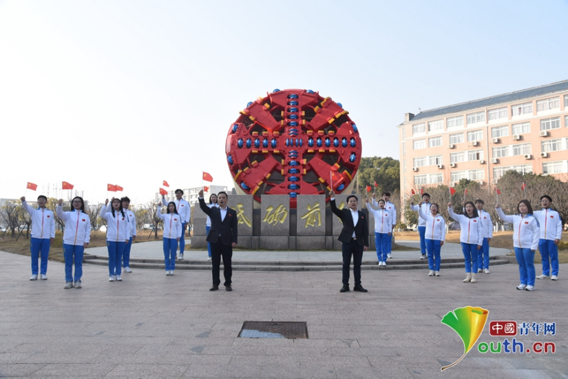 华东交大师生在盾构机实体雕塑前传唱《领航》。陈君 摄