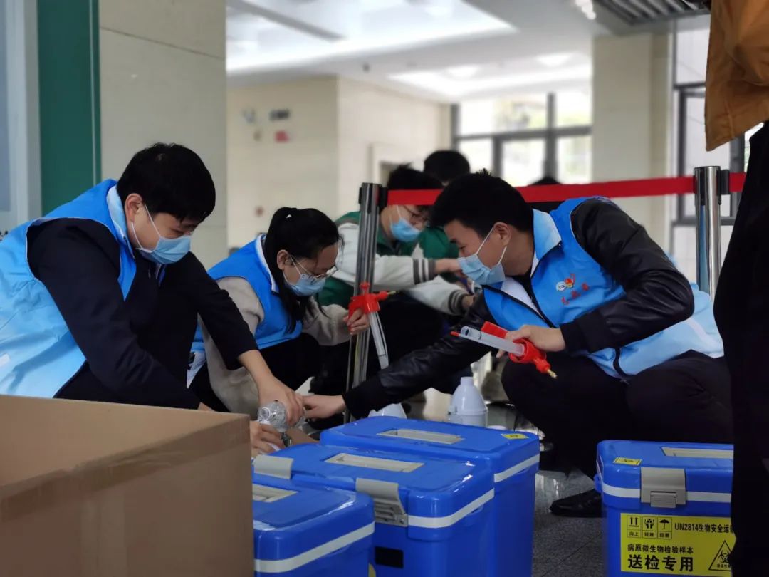 教工志愿者积极准备防疫物资,为核酸检测做好预备工作