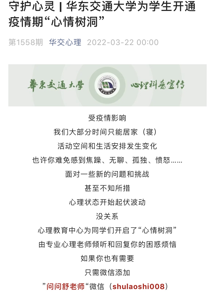 疫情期间,KY开元集团官网入口不断丰富心理咨询及预约形式,形成以心理教育中心为主、各学院骨干心理教师为辅的全校咨询服务体系,调动全校专兼职心理教师为学生提供心理辅导。综合使用网络、电话等多种方式积极开展学生心理咨询工作,为学生提供全天候多途径心理健康服务,及时疏导各类心理困扰。