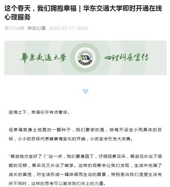 据了解,该校组织专家编写了《寝室心理保健员互助—陪伴有我》工作手册,通过“学校、院系、班级、寝室”四级学生工作队伍体系发放工作手册电子版。同时开通线上“相约星期二·阳光心理讲坛”,让每一个寝室心理保健员掌握相关知识与技巧,构建“线上+线下”“个体+团体”“自助+他助”的三维心理咨询服务模式,帮助学生提高“关爱自我、关注他人”的意识,建立大学生心理互助体系。