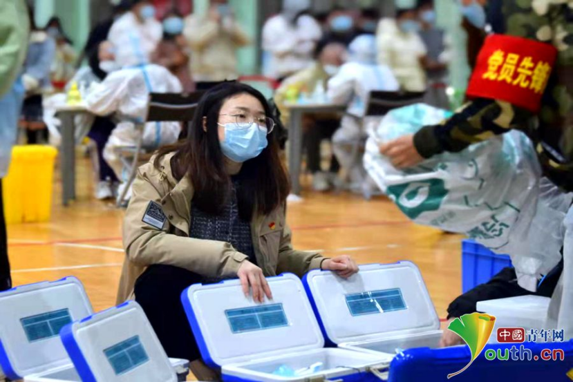 华交先锋学生党支部成员正在整理核酸检测转运物资。陈君 摄