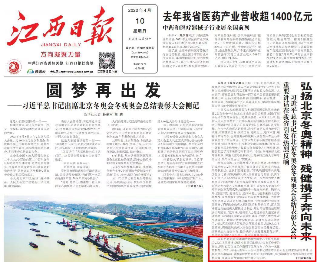 习近平总书记在北京冬奥会冬残奥会总结表彰大会的重要讲话在华东交大师生中引发热烈反响,《江西日报》今日头版刊发