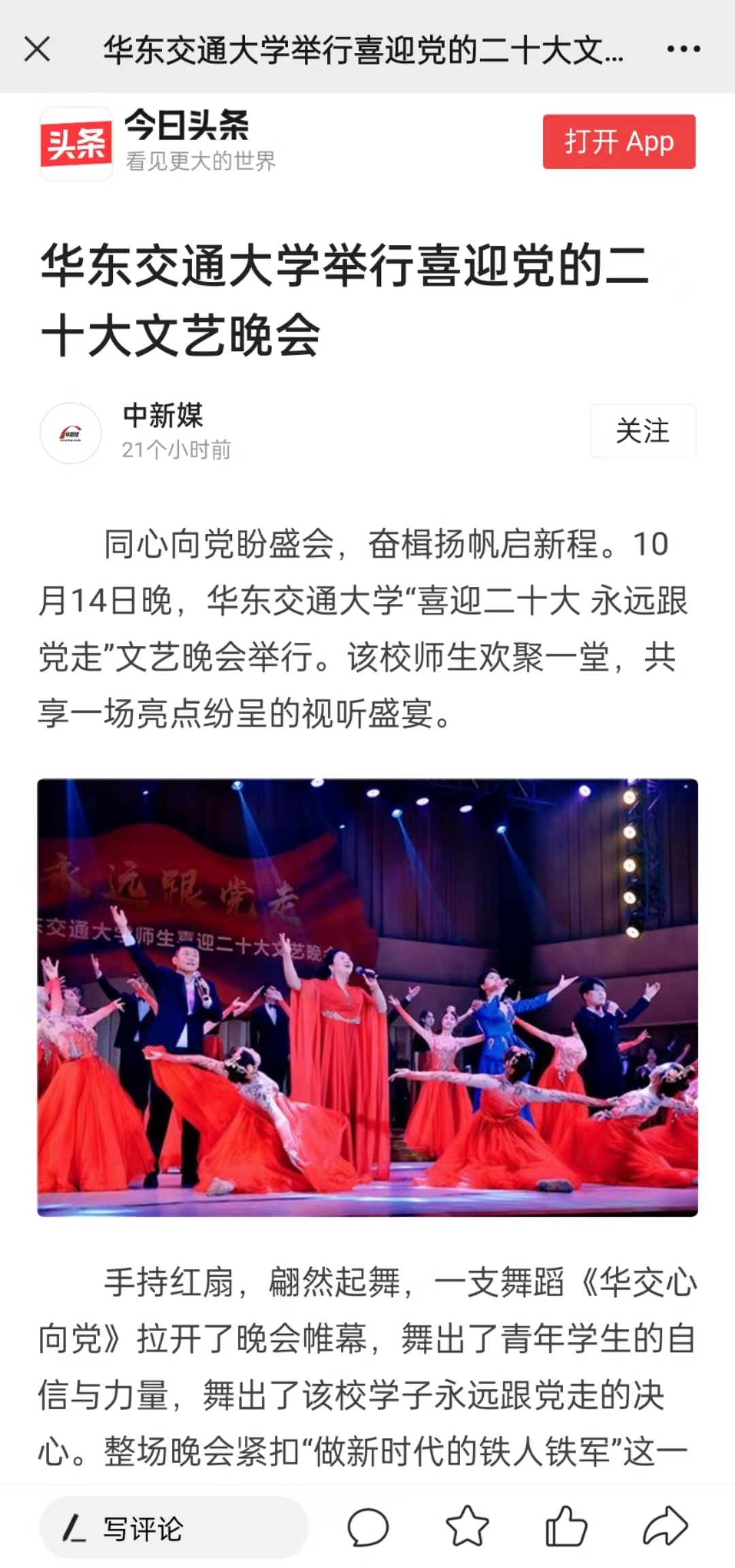 整场演出内容丰富、形式多样、充满正能量,一个个灵动的舞姿,一句句铿锵的宣讲,一声声真情的歌唱表达了该校师生浓浓的爱党爱国之情,传递出对党的二十大胜利召开的热烈期盼。
