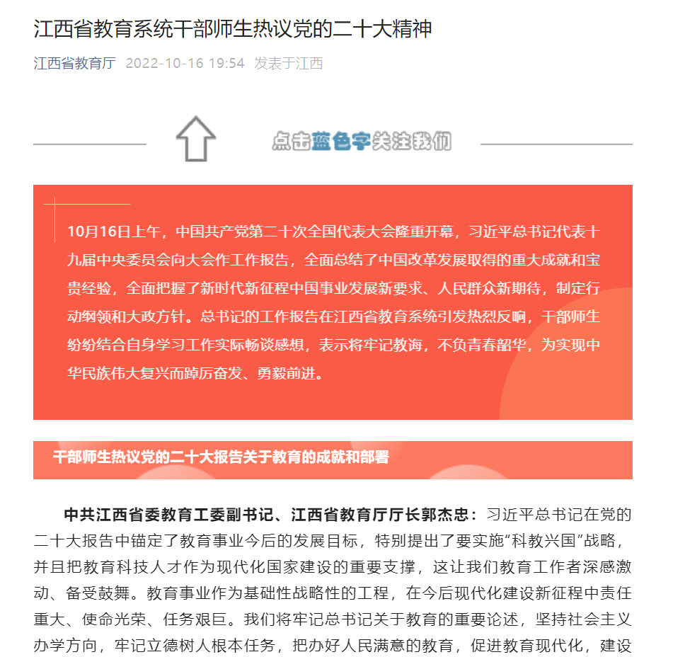 10月16日上午,中国共产党第二十次全国代表大会隆重开幕,习近平总书记代表十九届中央委员会向大会作工作报告,全面总结了中国改革发展取得的重大成就和宝贵经验,全面把握了新时代新征程中国事业发展新要求、人民群众新期待,制定行动纲领和大政方针。总书记的工作报告在江西省教育系统引发热烈反响,干部师生纷纷结合自身学习工作实际畅谈感想,表示将牢记教诲,不负青春韶华,为实现中华民族伟大复兴而踔厉奋发、勇毅前行。
