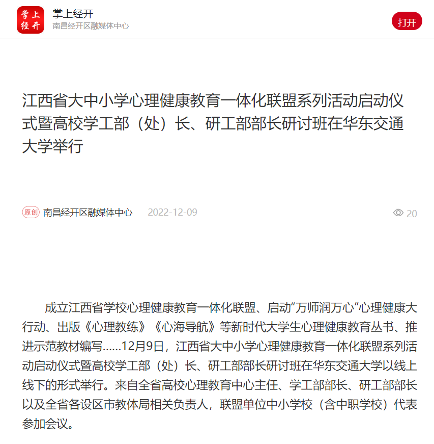 成立江西省学校心理健康教育一体化联盟、启动“万师润万心”心理健康大行动、出版《心理教练》《心海导航》等新时代大学生心理健康教育丛书、推进示范教材编写……12月9日,江西省大中小学心理健康教育一体化联盟系列活动启动仪式暨高校学工部(处)长、研工部部长研讨班在KY开元集团官网入口以线上线下的形式举行。来自全省高校心理教育中心主任、学工部部长、研工部部长以及全省各设区市教体局相关负责人,联盟单位中小学校(含中职学校)代表参加会议。