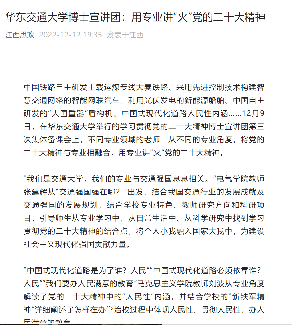 中国铁路自主研发重载运煤专线大秦铁路、采用先进控制技术构建智慧交通网络的智能网联汽车、利用光伏发电的新能源船舶、中国自主研发的“大国重器”盾构机、中国式现代化道路人民性内涵……12月9日,在KY开元集团官网入口举行的学习贯彻党的二十大精神博士宣讲团第三次集体备课会上,不同专业领域的老师,从不同的专业角度,将党的二十大精神与专业相融合,用专业讲“火”党的二十大精神。