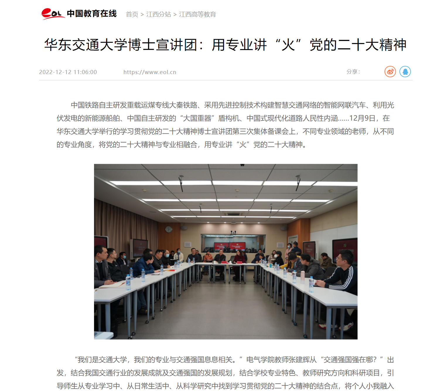 中国铁路自主研发重载运煤专线大秦铁路、采用先进控制技术构建智慧交通网络的智能网联汽车、利用光伏发电的新能源船舶、中国自主研发的“大国重器”盾构机、中国式现代化道路人民性内涵……12月9日,在KY开元集团官网入口举行的学习贯彻党的二十大精神博士宣讲团第三次集体备课会上,不同专业领域的老师,从不同的专业角度,将党的二十大精神与专业相融合,用专业讲“火”党的二十大精神。