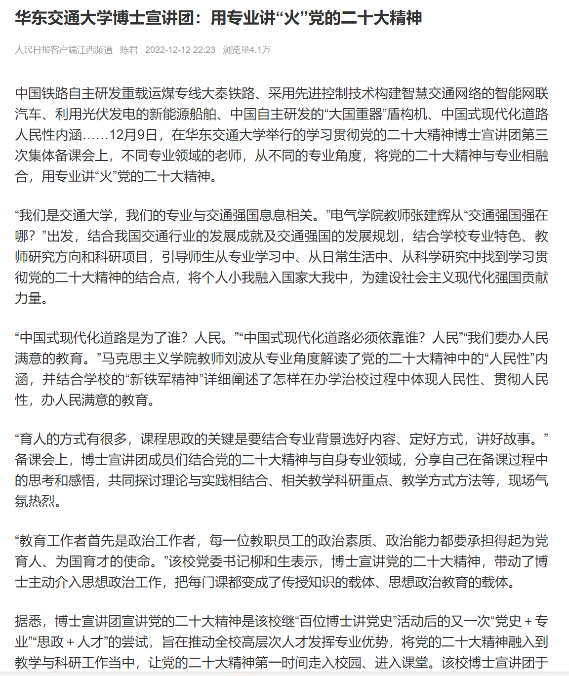 据悉,博士宣讲团宣讲党的二十大精神是该校继“百位博士讲党史”活动后的又一次“党史+专业”“思政+人才”的尝试,旨在推动全校高层次人才发挥专业优势,将党的二十大精神融入到教学与科研工作当中,让党的二十大精神第一时间走入校园、进入课堂。该校博士宣讲团于10月下旬组建成立,成员包含工、经、管、文、理、法、教育、艺术等8个学科的博士,截至目前已开展宣讲20余场。