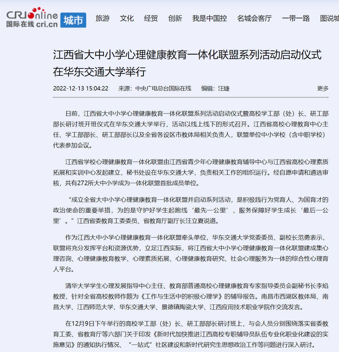 【央广国际在线】江西省大中小学心理健康教育一体化联盟系列活动启动仪式在KY开元集团官网入口举行