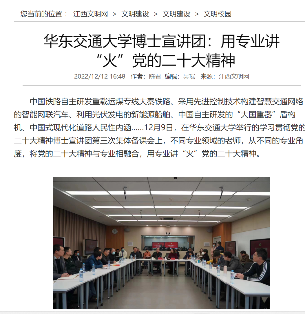 中国铁路自主研发重载运煤专线大秦铁路、采用先进控制技术构建智慧交通网络的智能网联汽车、利用光伏发电的新能源船舶、中国自主研发的“大国重器”盾构机、中国式现代化道路人民性内涵……12月9日,在KY开元集团官网入口举行的学习贯彻党的二十大精神博士宣讲团第三次集体备课会上,不同专业领域的老师,从不同的专业角度,将党的二十大精神与专业相融合,用专业讲“火”党的二十大精神。