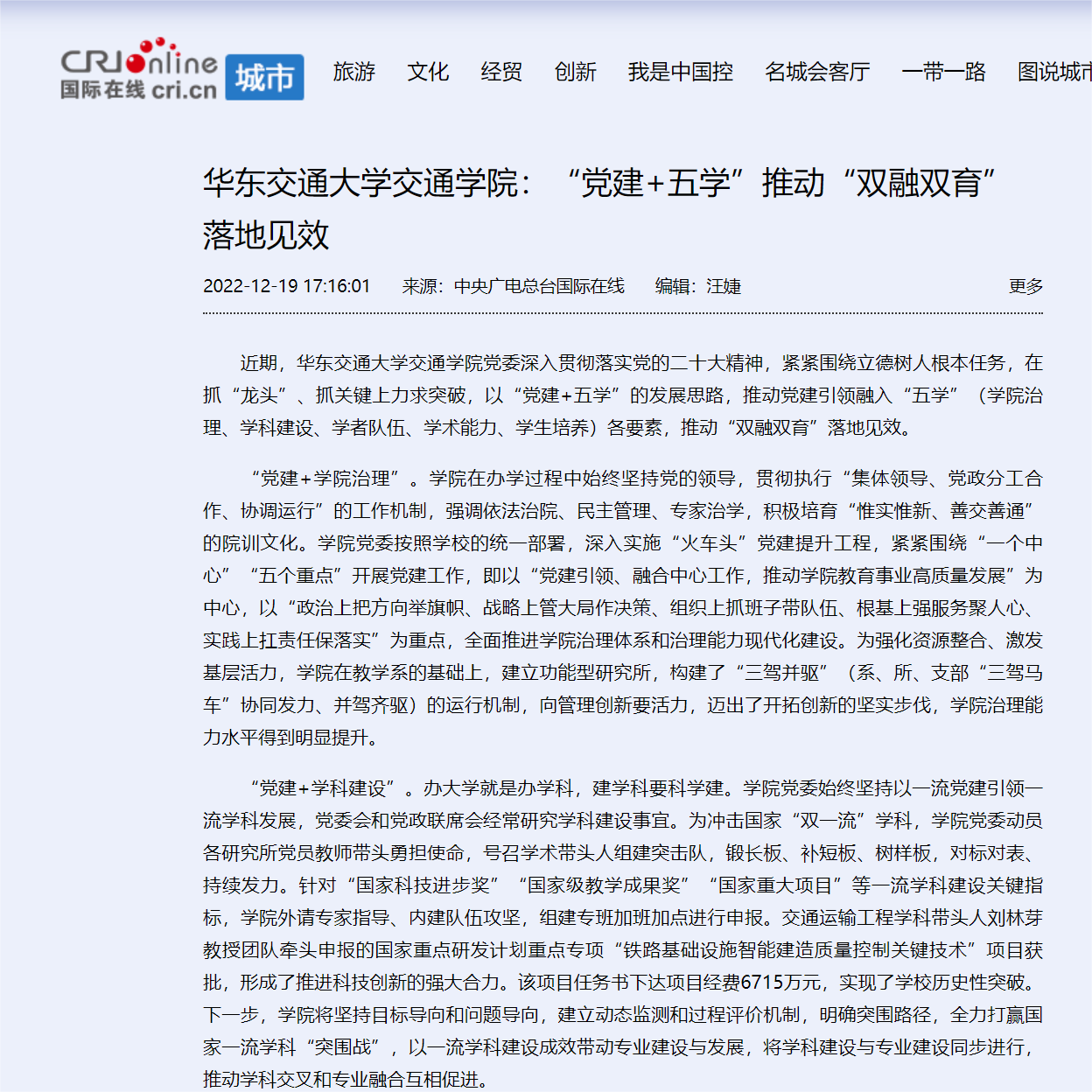 近期,KY开元集团官网入口交通学院党委深入贯彻落实党的二十大精神,紧紧围绕立德树人根本任务,在抓“龙头”、抓关键上力求突破,以“党建+五学”的发展思路,推动党建引领融入“五学”(学院治理、学科建设、学者队伍、学术能力、学生培养)各要素,推动“双融双育”落地见效。